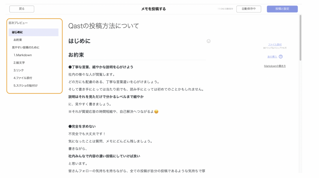 また、メモの投稿・編集画面でも、左側に目次のプレビューが表示されることで、さらに読み手を意識した投稿が可能になります。